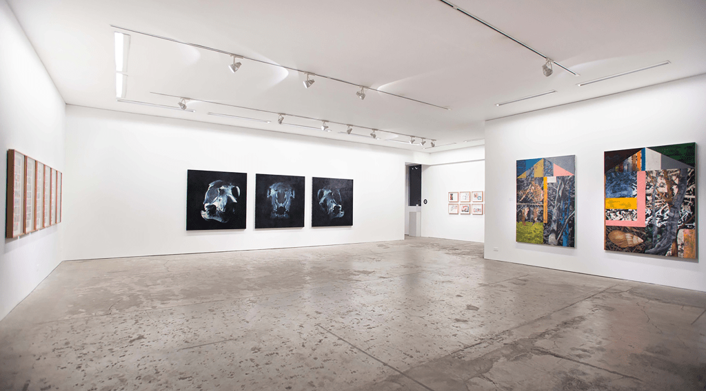 Another way to see Gathered Narratives is the relationship between one artist’s practice to the other: for one, are the layers in Isabel’s mixed media collages a predilection she inherited from her father? Do the wrinkles and rumples in Mona’s paintings encourage a way of looking that is up close and intimate as in the exposed skulls in Luis’ photorealistic paintings? Is the presence of grids in Carina’s work an extension of the parallel lines in Luis’ sole diptych and photographic pieces as well as the geometric inclinations in Soler and Mona’s respective paintings?